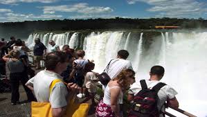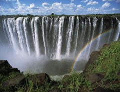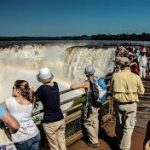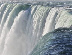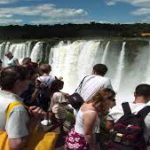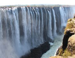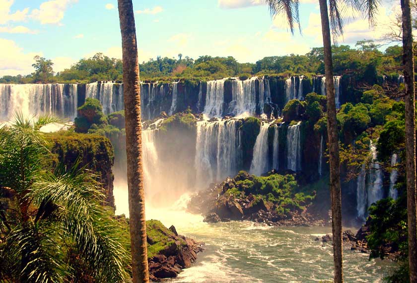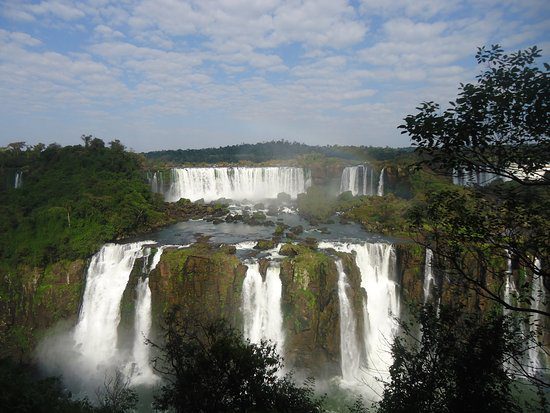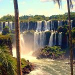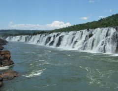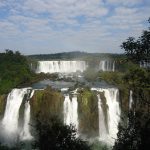 - South America’s Cataratas del Iguazo is also known as Iguazo Falls. Part of the Rio Iguazo, the falls straddle the border between Argentina and Brazil. This 8,800-foot wide waterfall drops rough 269 feet. Most of the river fall down into an area known as Garganta del Diablo, or The Devil’s Throat, but the rest spreads out over a wide, flat shelf, splitting into hundreds of individual falls.