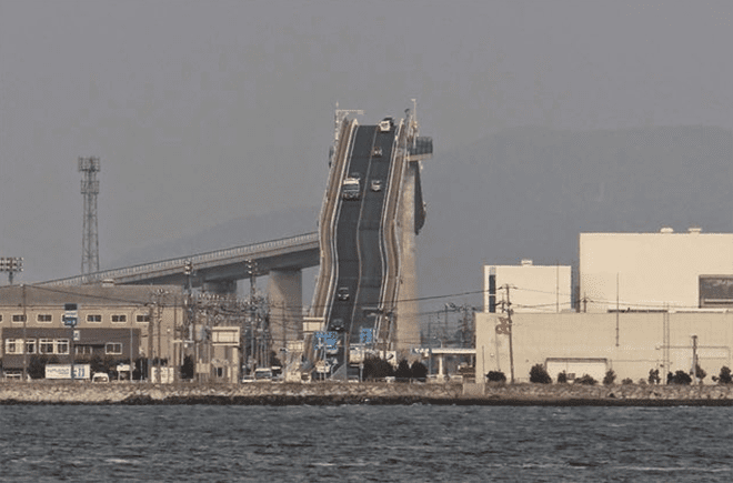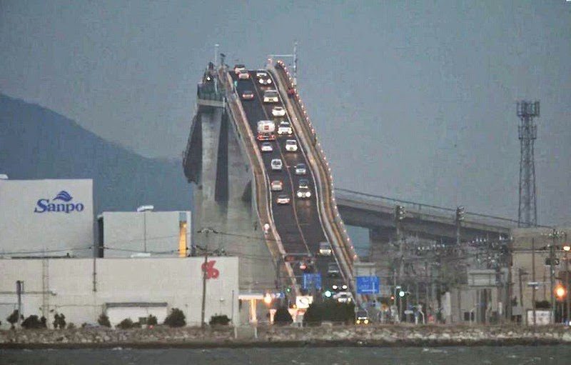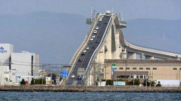 - Although it is just a bridge, it is as dangerous as the roads we mentioned above. The bridge connects Sakaiminato and Matsue. It is about 1.7 km long, and 11.3 meters wide. From the far, the bridge seems impossible to climb. This height allows large ships to pass underneath.