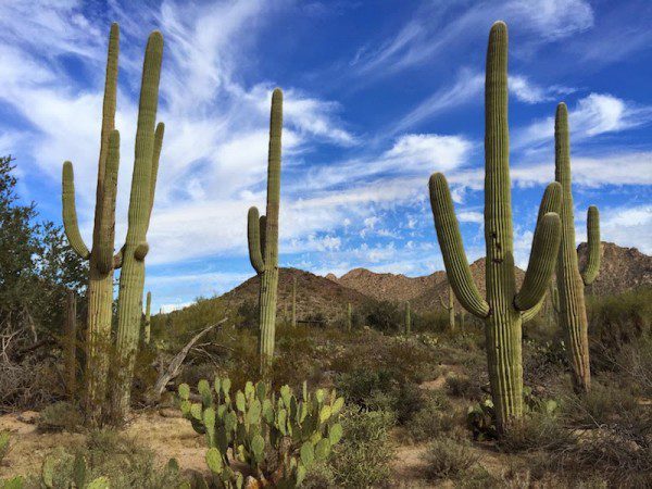- Saguaro cactus is unnatural desert plant native to Sonoran desert of Arizona. It grows up to height of 25 feet and have several branches in upward direction in shape of columns. This mysterious desert plant have no leafs at all and used to bloom at spring time. The flower of saguaro cactus found as national flower of Arizona.