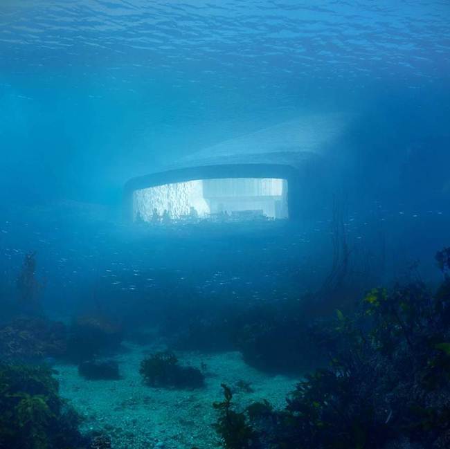 - The descent to the restaurant is through three floors. The entrance is on the coast and the building looks like the sea swallows it.